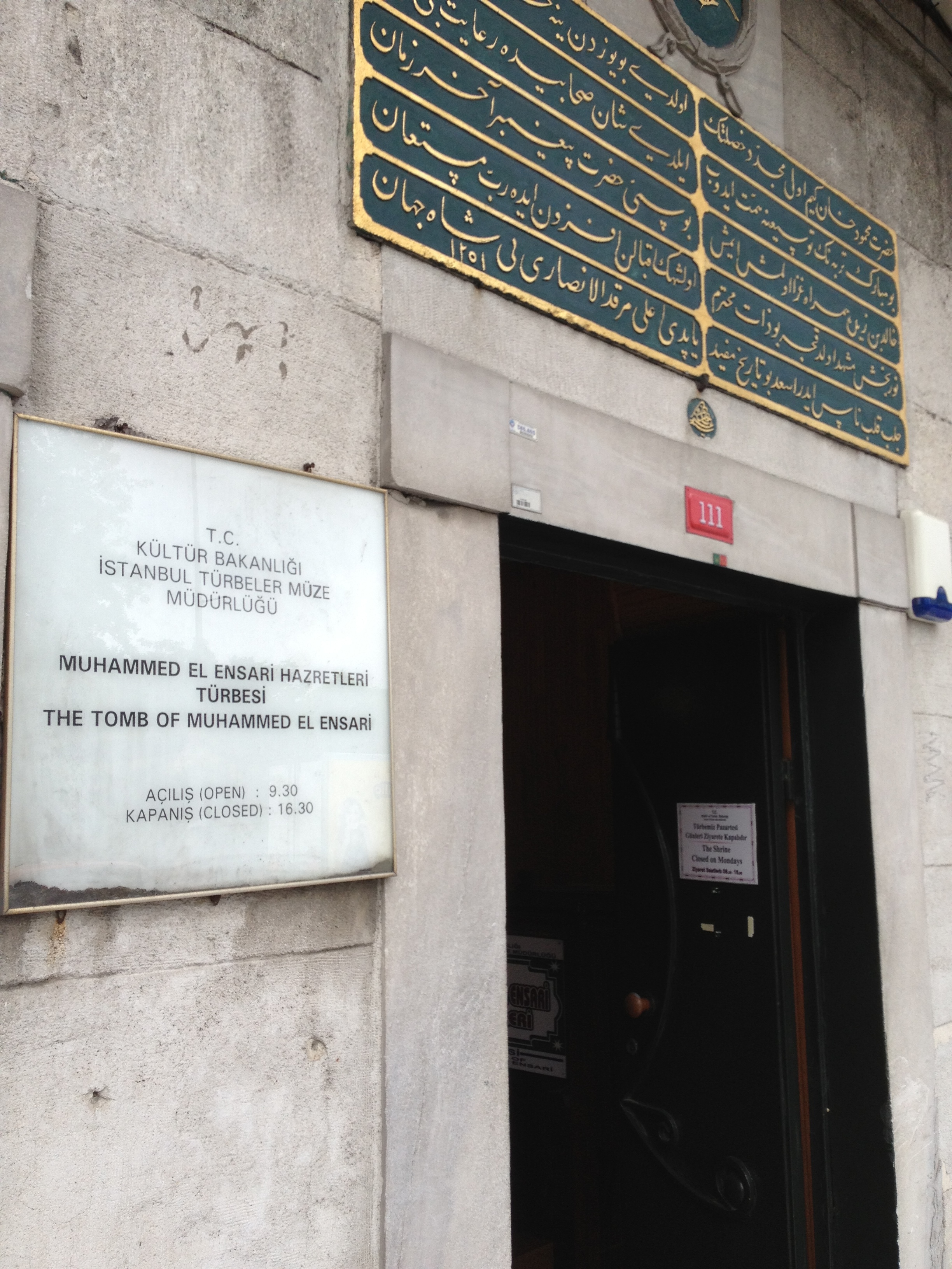 As for this tomb, there does not appear to be a Companion known by the name Adham. A sign in the window mentions a person by the name of Halid/Khālid and the year 46/666. Al-Ṭabarī mentions that ‘Abd al-Raḥmān, the son of the famous Khālid b. al-Walīd (d. 21/642), possibly led a campaign against the Byzantines in 46 before being killed by poison later that same year. (al-Ṭabarī, History, 18:88-9). Notably ‘Abd al-Raḥmān had led an earlier campaign into Byzantium in 44 as well (al-Ṭabarī, History, 18:71). The sign may have mistaken ‘Abd al-Raḥmān for his father Khālid who also reportedly participated in fighting against the Byzantines during his lifetime. Thus the tomb may have been thought by later Muslims to have belonged to a Companion who partook in the second campaign of ‘Abd al-Raḥmān. However, according to Haskan Mehmet Nermi it appears that the designation of the grave as a Companion’s burial site is entirely incorrect and that it properly belongs to an Ethem Baba who died in 1460 CE (Nermi, Eyüp Sultan Tarihi, p. 149).