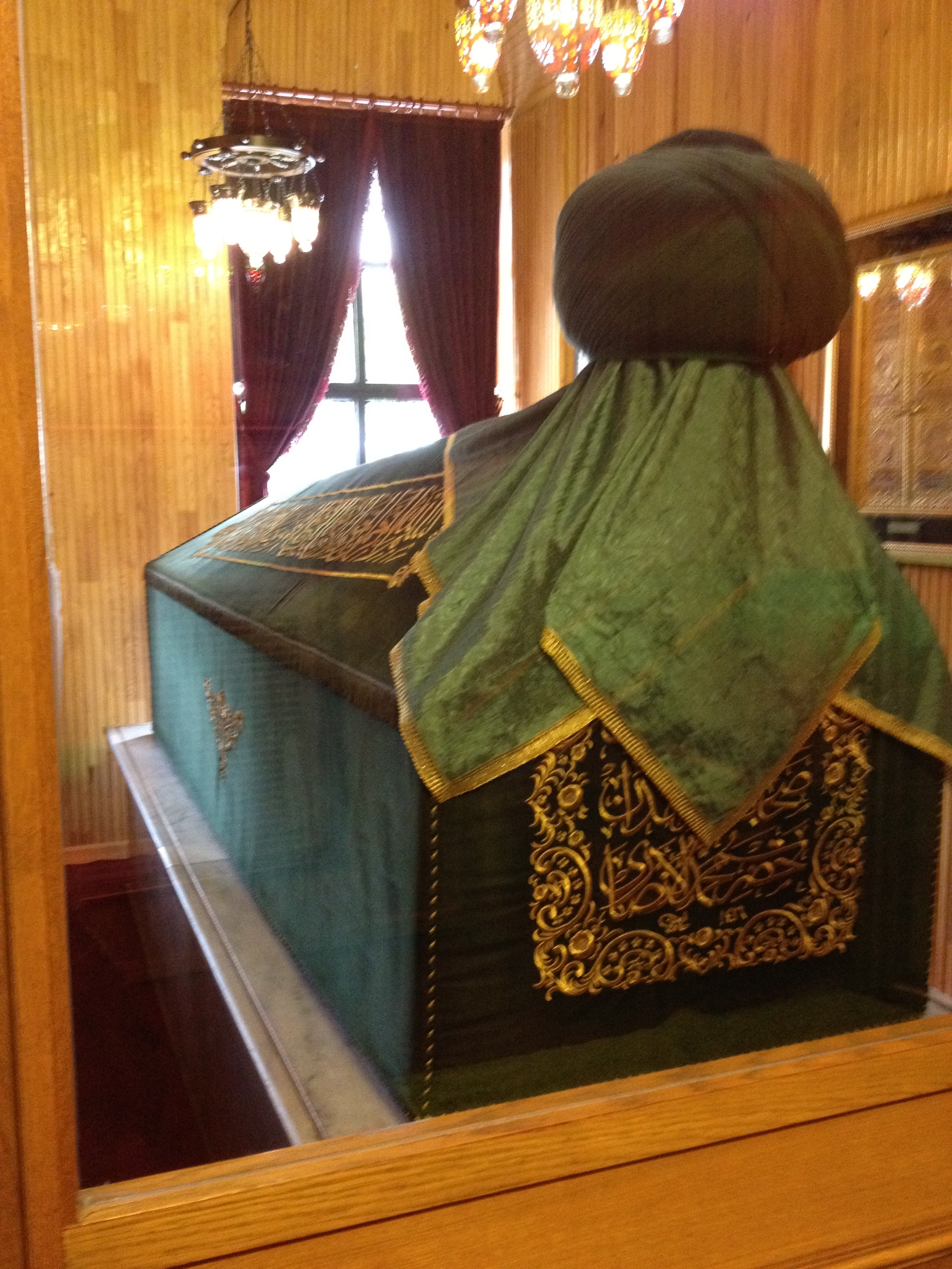 Upon entering the gardened complex there is a separate stone building off to the right that shelters the grave of Ka’b. One can enter to see the tomb housed between an edifice of wood and glass. The tomb of Ka’b appears to have once been located inside Yavedud Camii, a nearby mosque, but was moved at some point to its present location in the shrine complex. As for the Ka’b resting therein, it is entirely unclear which Ka’b is intended.